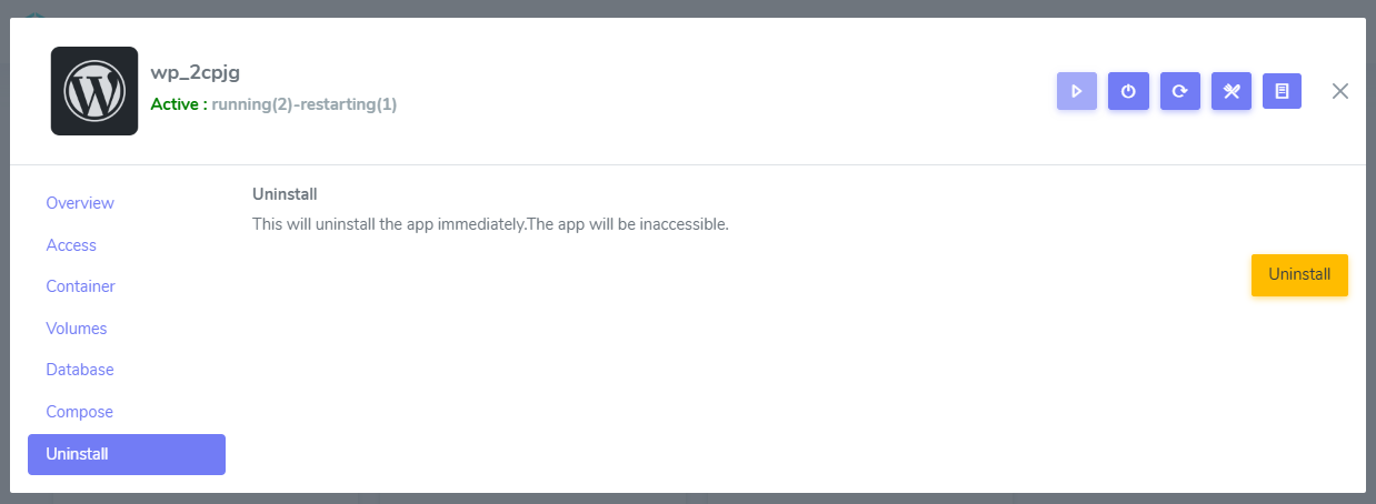 Websoft9 simplify the main operations of the application: start, stop, restart, redeploy, uninstall, and so on.