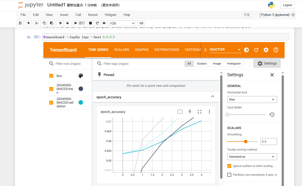 2. Refer to Using TensorBoard in Notebooks, and run the example programs in sequence. Add the parameter --host 0.0.0.0 to the last command (to allow external access).